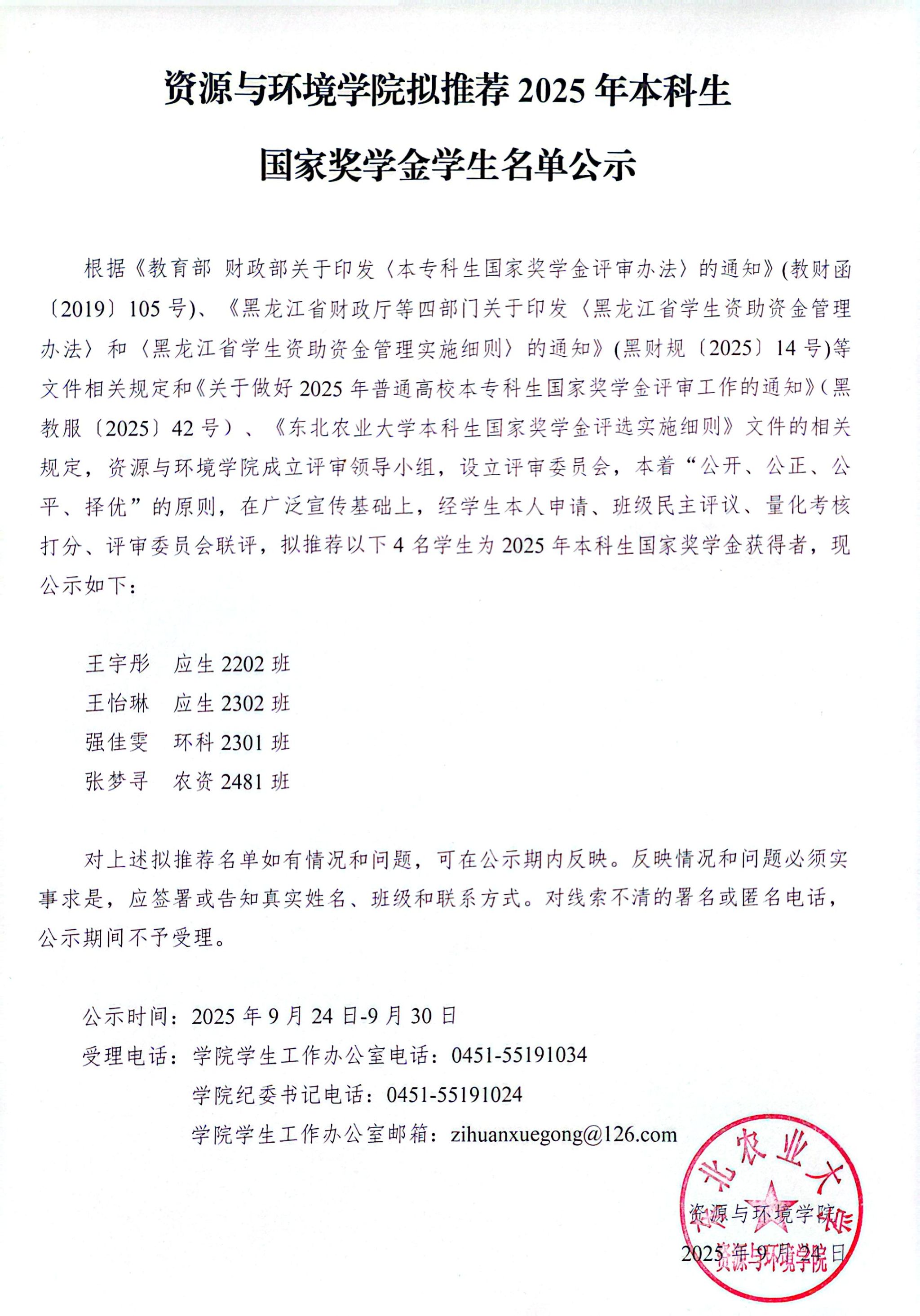 永利304官网唯一拟推荐2025年本科生国家奖学金学生名单公示