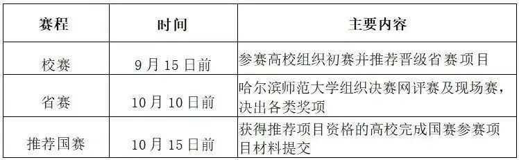 (三)省赛(10月10日前)省级决赛分为线上评审和现场赛(具体时间见第二轮通知),根据国家名额要求,确定入围国赛项目。